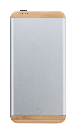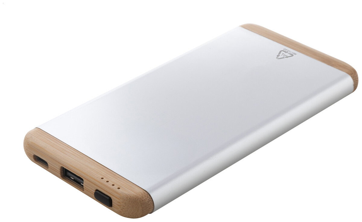 Power banka z recyklovaného hliníku a bambusu s baterií 5000 mAh. S 1 portem USB a 1 portem USB-C pro nabíječku. Vstupní port USB-C. Včetně USB nabíjecího kabelu.