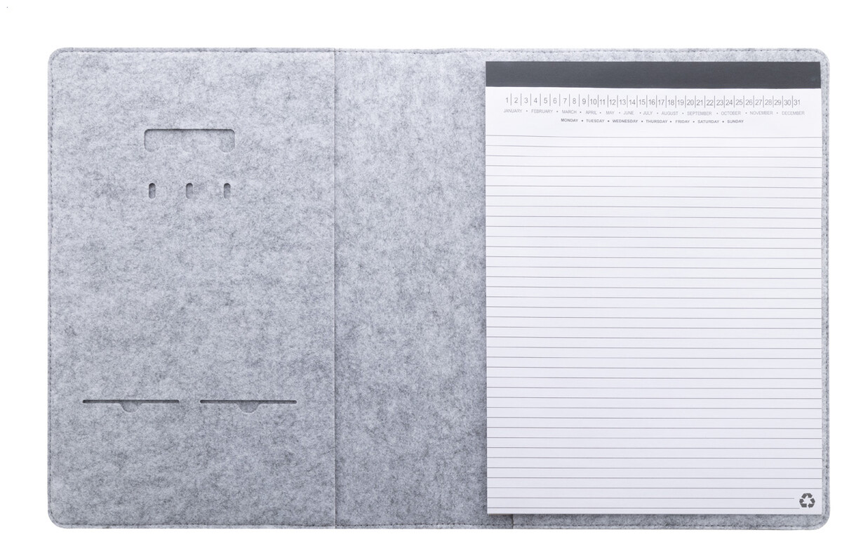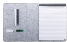 Plstěná sloha A4 na dokumenty z RPET s předními a několika vnitřními kapsami s organizérem. S 20 linkovanými listy poznámkového bloku z recyklovaného papíru.