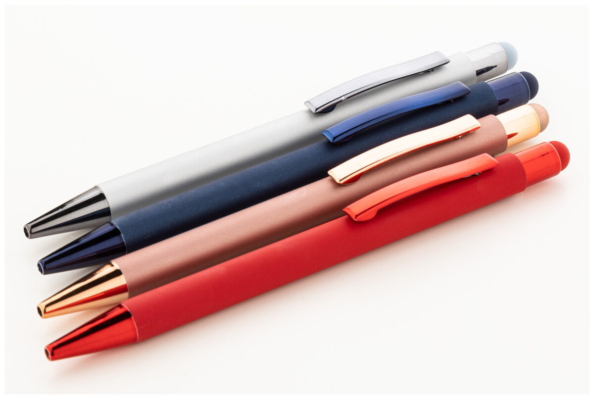 Recyklované hliníkové kuličkové a dotykové pero s pogumovaným tělem a barevnými lesklými kovovými částmi. Se speciální vrstvou pro zrcadlové gravírování odpovídající kovovým částem. S modrou náplní.