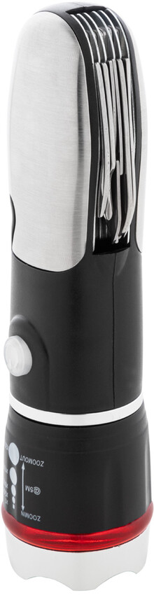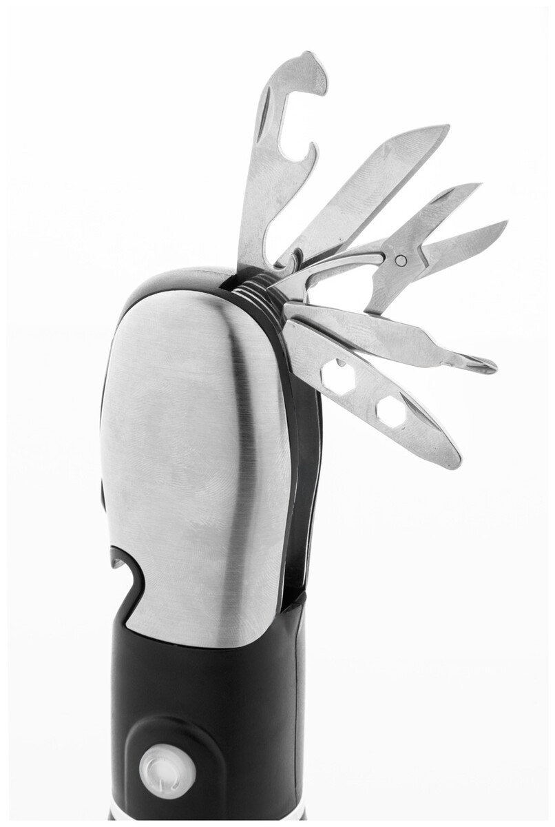 ABS a nerezová multifunkční baterka s nouzovým kladívkem, řezačkou bezpečnostních pásů a multifunkčním nářadím s 9 funkcemi. Se zoomovatelným LED světlem a 3 světelnými režimy. Funguje na 3 baterie AAA, bez baterií.