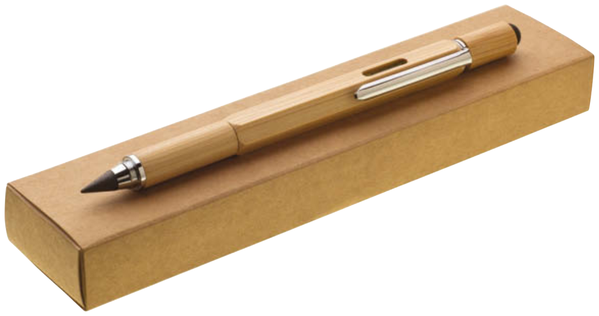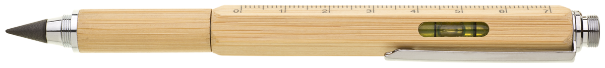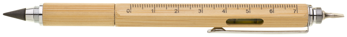 Tzv. nekonečná mutifunkční bambusová tužka 6v1 natur v papírové krabičce. Hrot ze slitiny hliníku a grafitu píše podobně jako grafitová tužka, bez ořezávání je stále ostrý a stopa jde gumovat. Dodáváno s víčkem. 1/ Nekonečná tužka s hrotem ze slitiny hliníku a grafitu 2/ touch konec 3/ 7 cm pravítko. 4/ vodováha 5/ šroubovák plochý 6/ šroubovák křížový