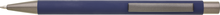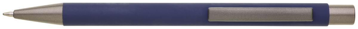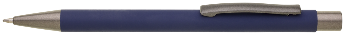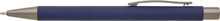 Kovová propiska CAGERI SOFT s hnědo-černými doplňky, s tmavě modrým pogumovaným povrchem. Velkoobsahová modrá náplň.