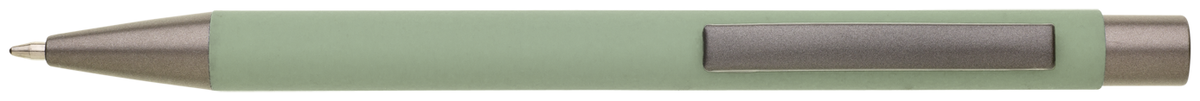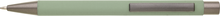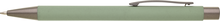 Kovová propiska CAGERI SOFT s hnědo-černými doplňky, se světlou zelenou pogumovanou povrchovou úpravou. Velkoobsahová modrá náplň.