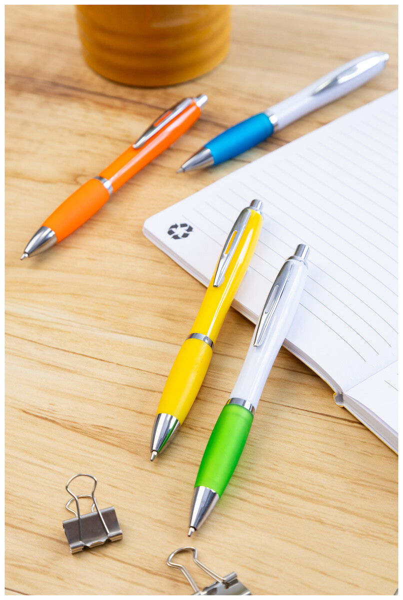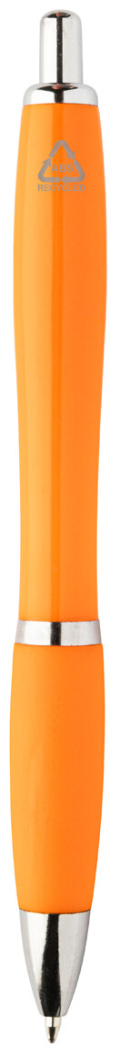 Kuličkové pero z recyklovaného ABS plastu s úchopem v odpovídající barvě a chromovanými částmi. S modrou náplní.