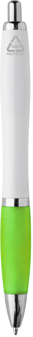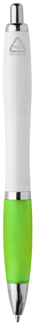 Kuličkové pero z recyklovaného ABS plastu s bílým tělem, barevným úchopem a chromovanými částmi. S modrou náplní.