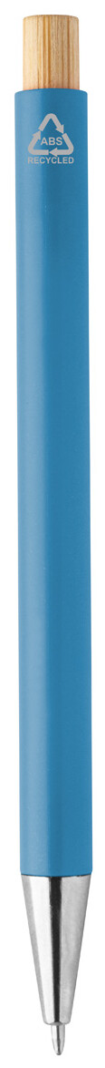Kuličkové pero z recyklovaného ABS plastu s bambusovým tlačítkem a kovovým klipem. S modrou náplní.