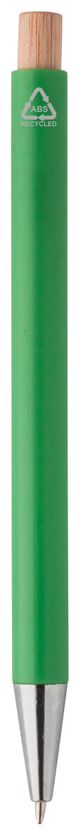 Kuličkové pero z recyklovaného ABS plastu s bambusovým tlačítkem a kovovým klipem. S modrou náplní.