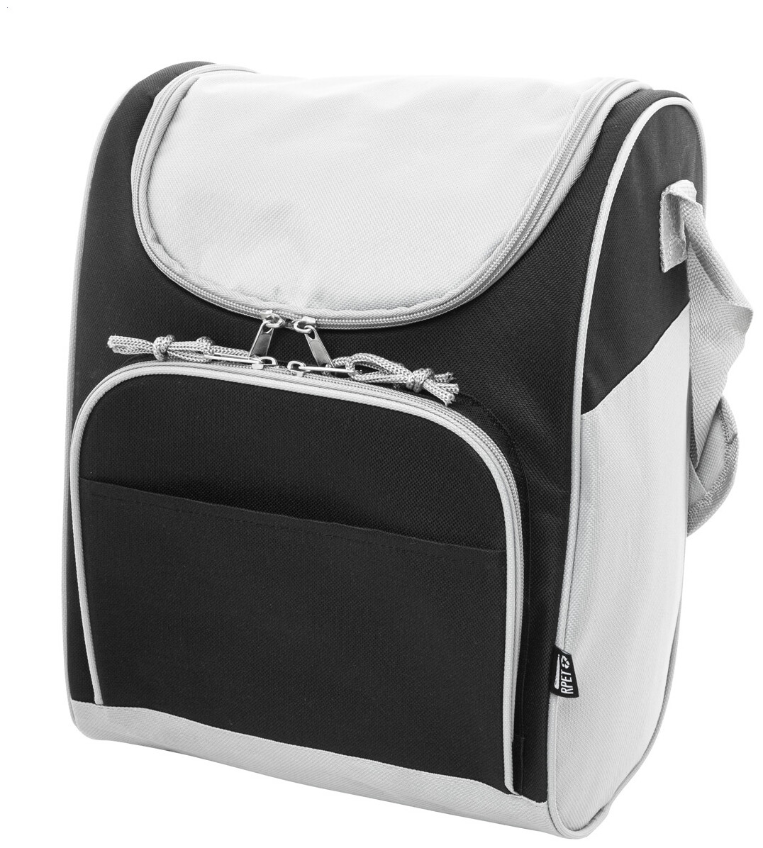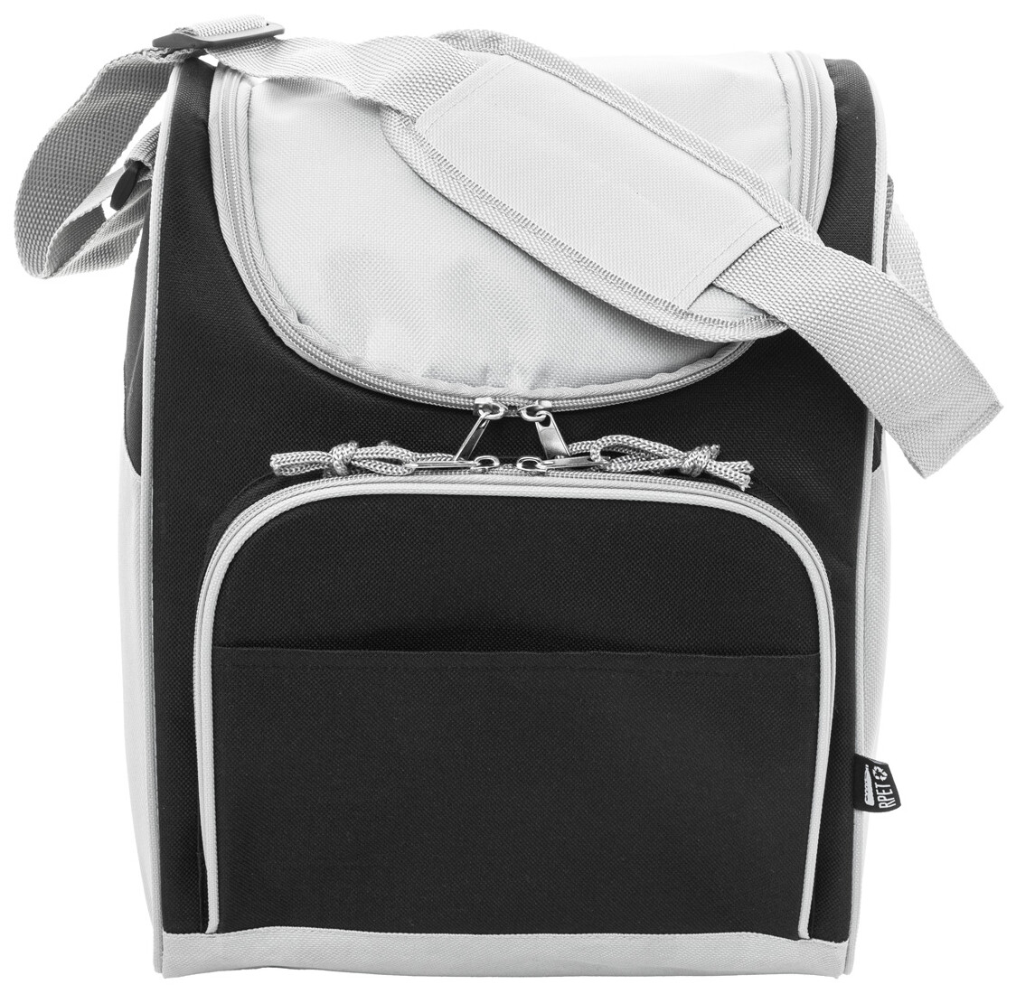 Chladicí taška RPET s hliníkovým polstrováním. Se 2 přihrádkami na zip, malou přední kapsou a nastavitelným ramenním popruhem. 600D RPET polyester s výrazným štítkem RPET.