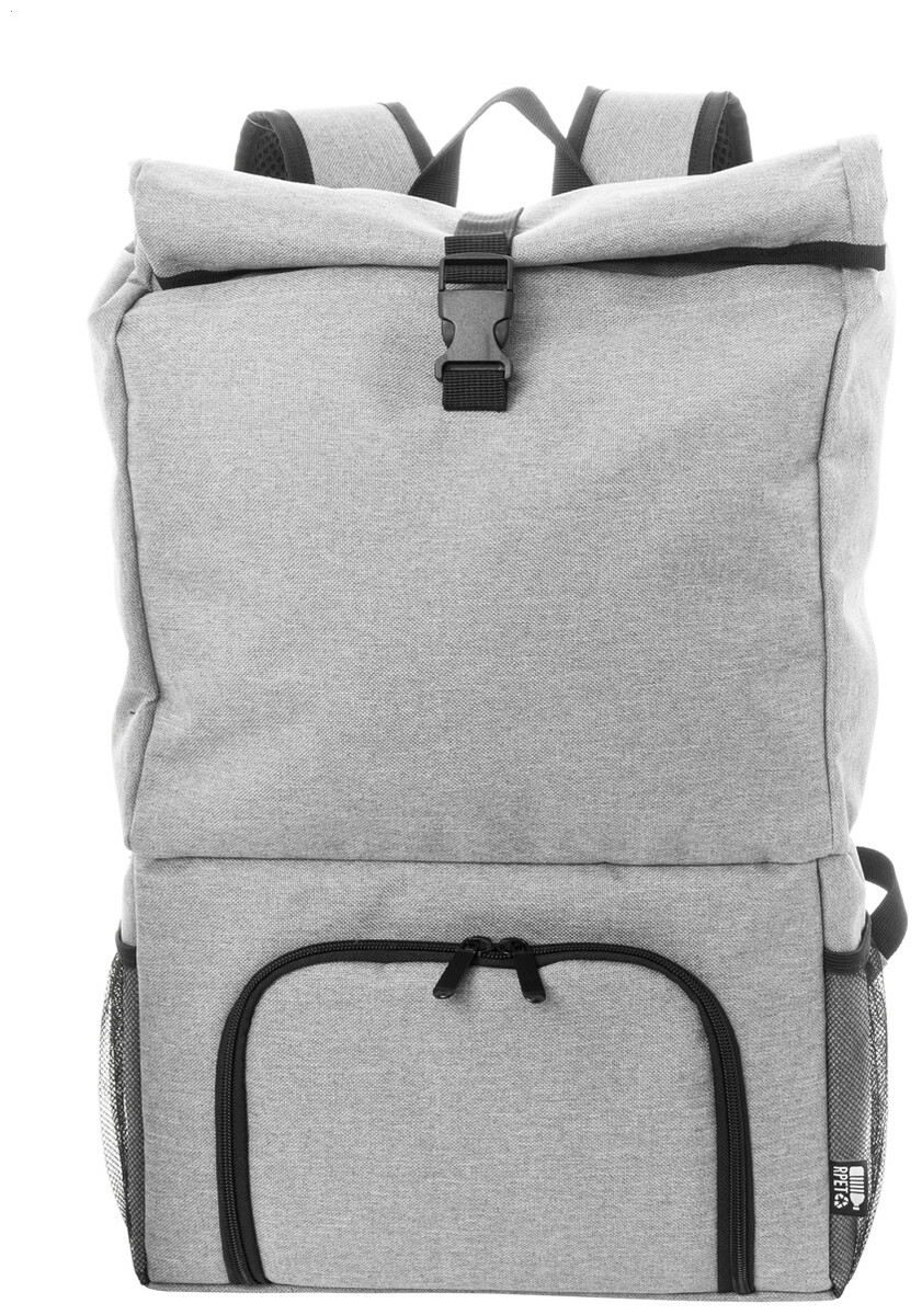 Rolltop RPET chladící batoh s PEVA polstrovanou chladicí přihrádkou na zip na jídlo. S hlavní přihrádkou na sponu, přední kapsou na zip, bočními síťovanými kapsami a polstrovanými ramenními popruhy. 600D RPET polyester s výrazným štítkem RPET.