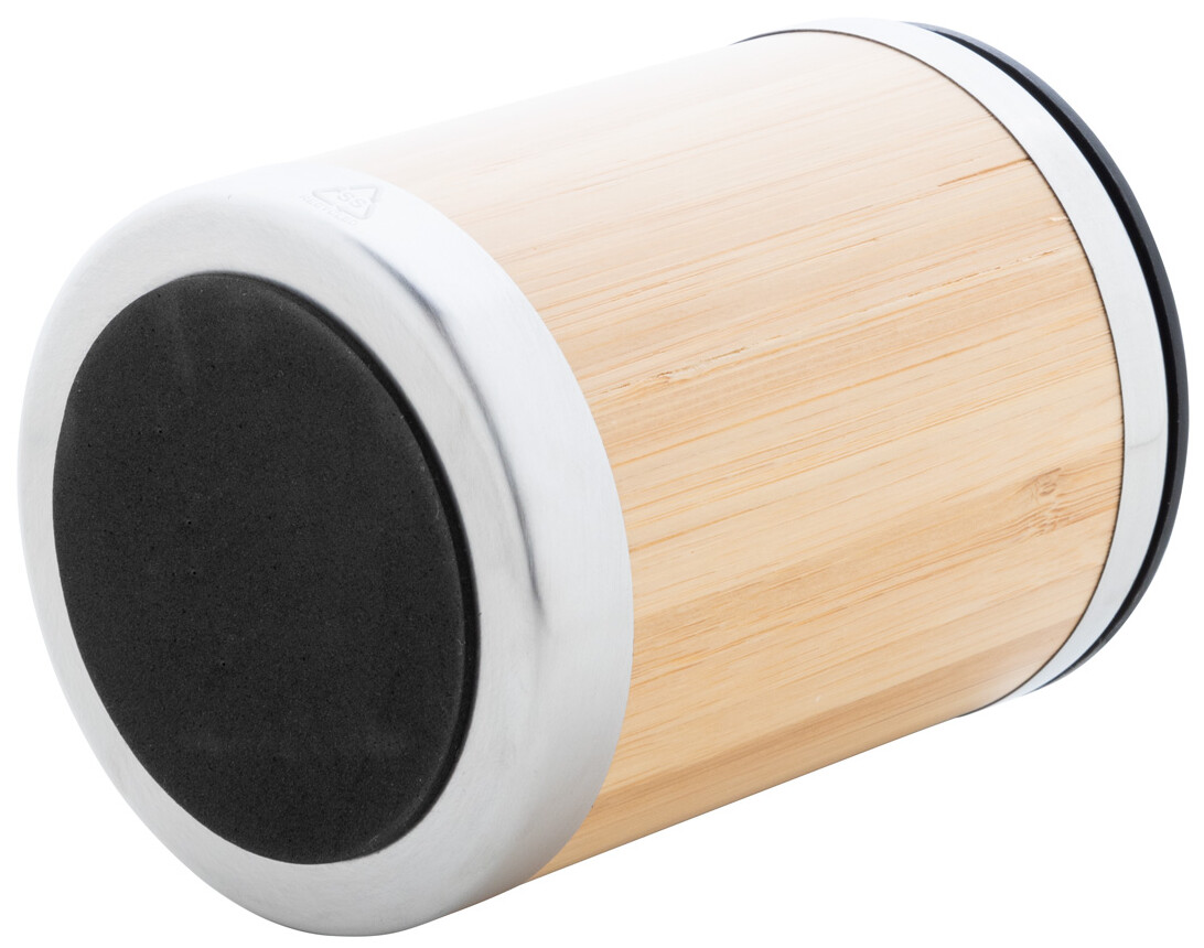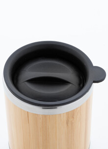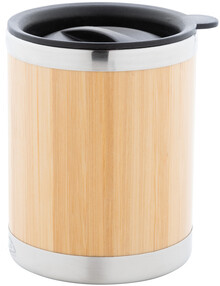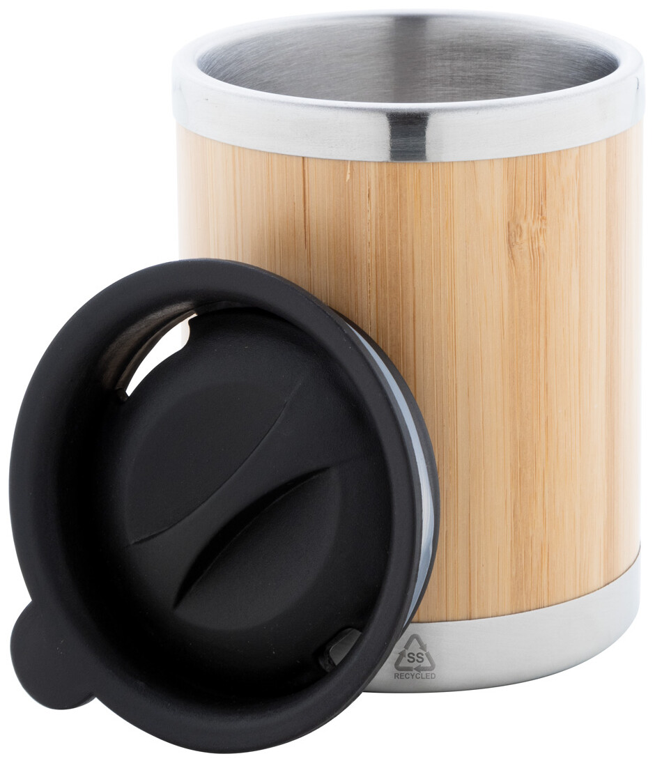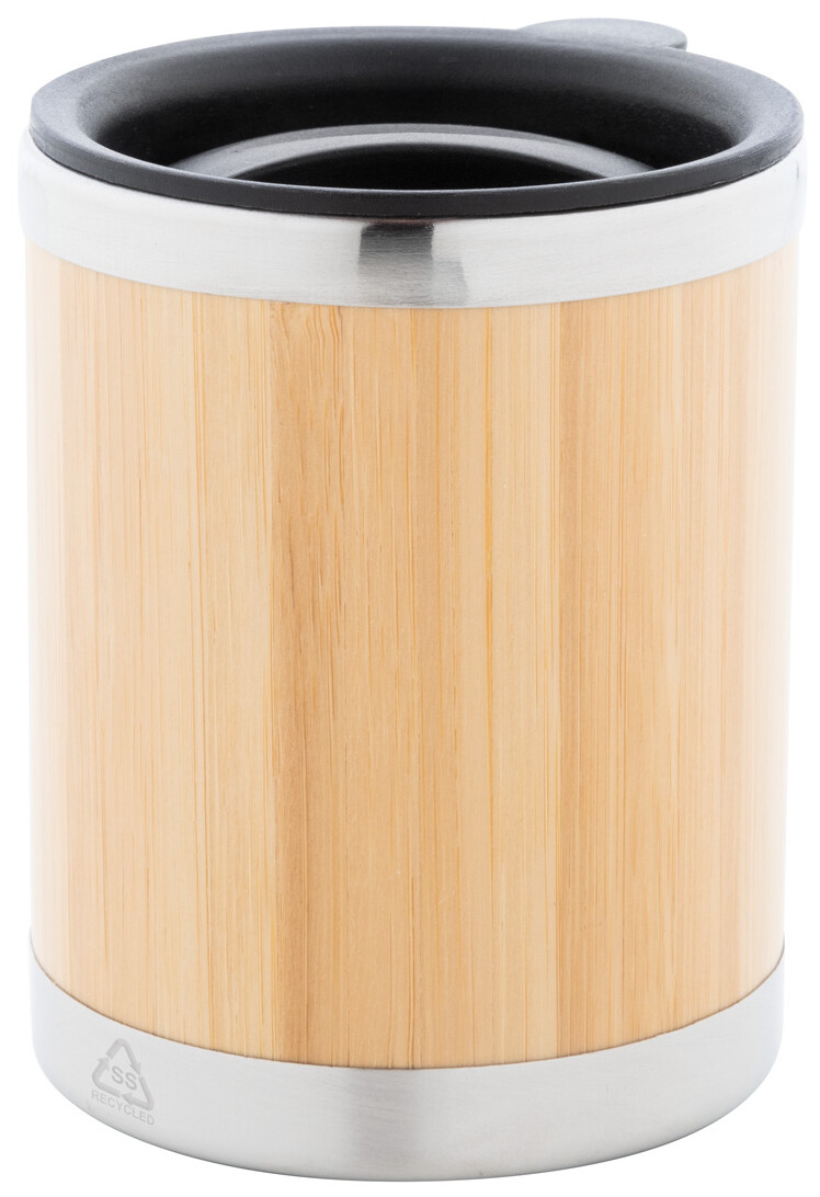 Bambusem pokrytý, dvoustěnný recyklovaný nerezový izolovaný termo hrnek s PP víčkem na pití, 300 ml.