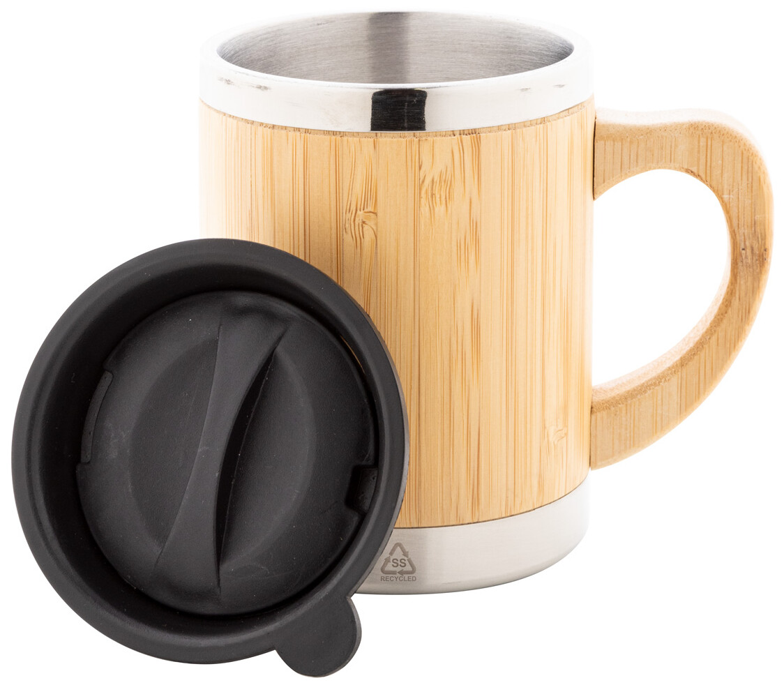 Bambusem potažený, dvoustěnný recyklovaný nerezový izolovaný termo hrnek s bambusovým uchem a PP víčkem na pití, 300 ml.