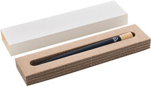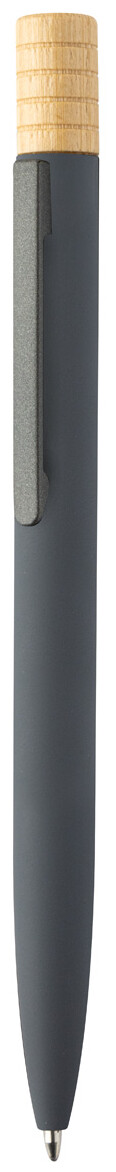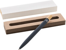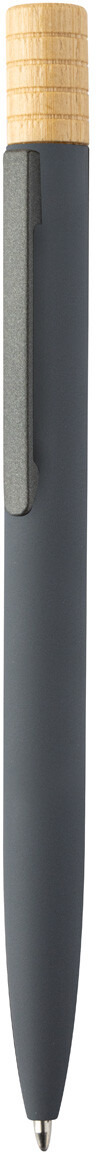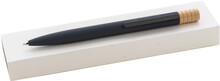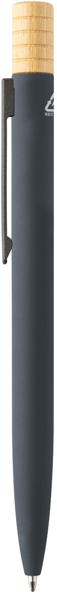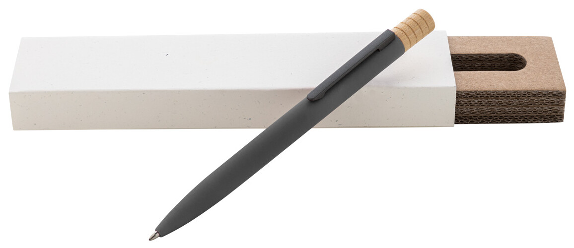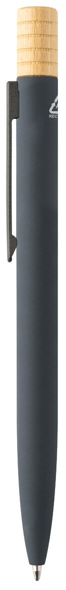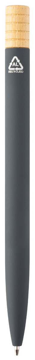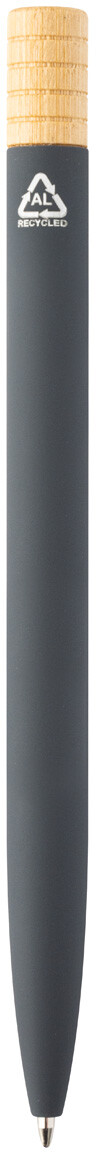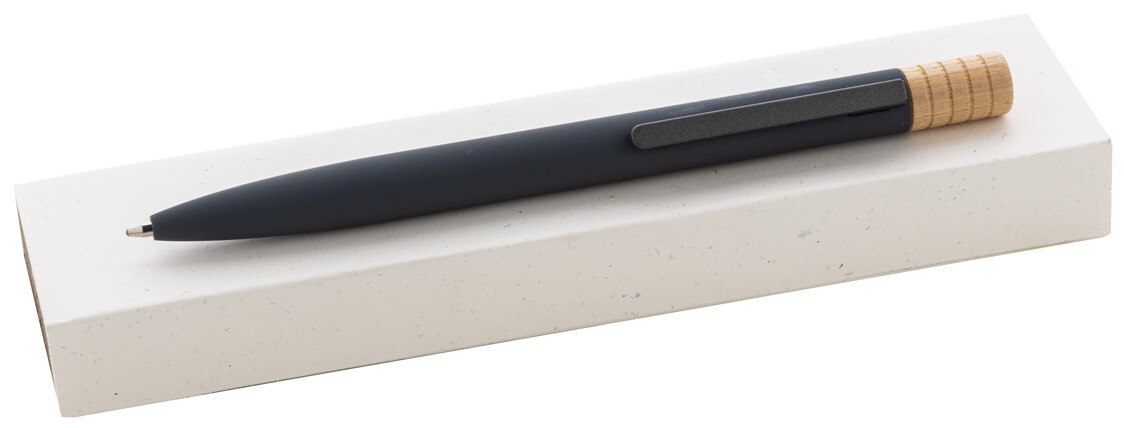 Kuličkové pero z recyklovaného hliníku s kovovým klipem a bambusovým vrškem. S modrou náplní. V kraftové papírové krabičce.