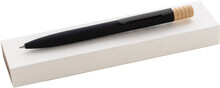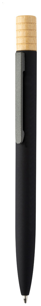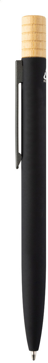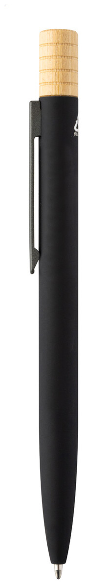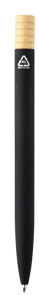 Kuličkové pero z recyklovaného hliníku s kovovým klipem a bambusovým vrškem. S modrou náplní. V kraftové papírové krabičce.