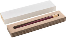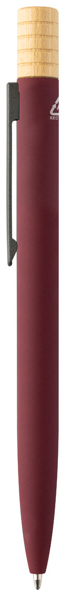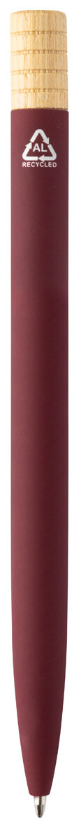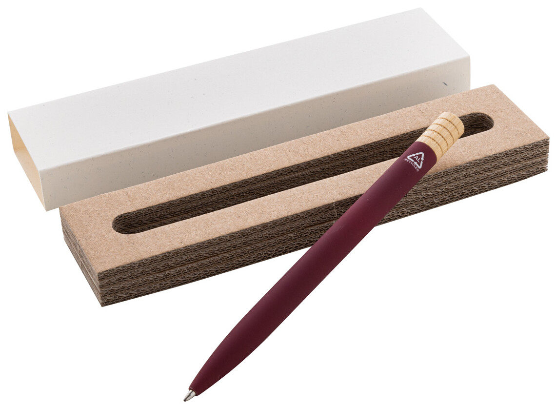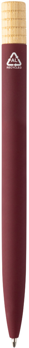 Kuličkové pero z recyklovaného hliníku s kovovým klipem a bambusovým vrškem. S modrou náplní. V kraftové papírové krabičce.