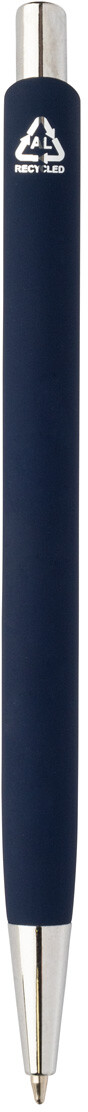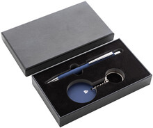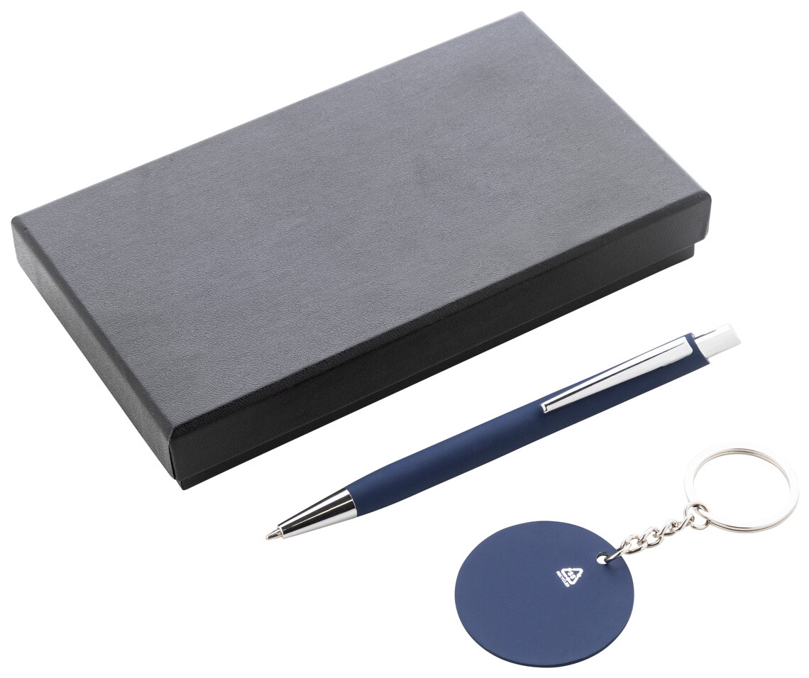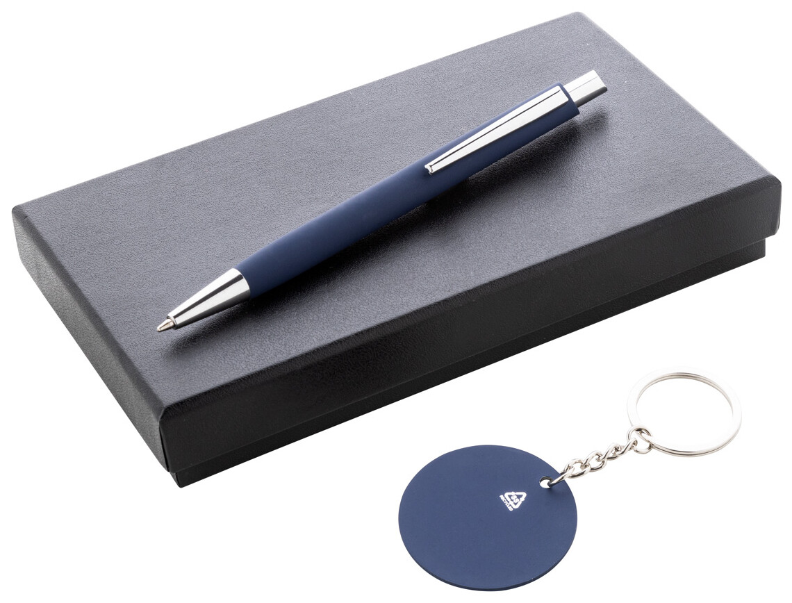 2dílná dárková sada v černé papírové dárkové krabičce. Včetně kuličkového pera z recyklovaného hliníku s pogumovaným povrchem a modrou náplní a přívěsku na klíče z recyklované nerezové oceli s pogumovaným povrchem. Obě položky mají speciální povrchovou úpravu pro zrcadlové laserové gravírování.