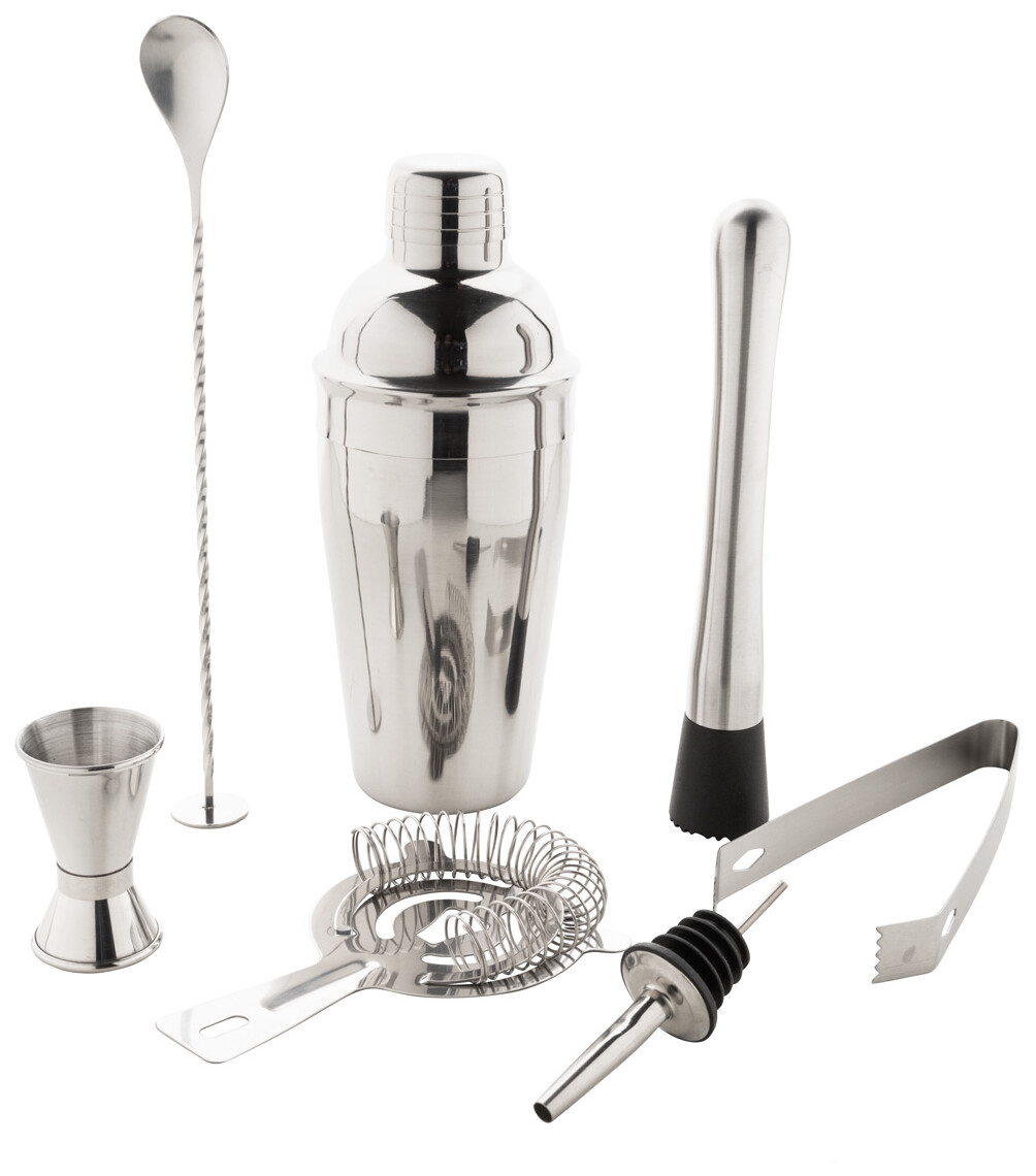 7dílná sada na koktejly z nerezové oceli v bambusovém stojanu. Obsahuje: šejkr na koktejly (550 ml), odměrku, sítko, barovou lžičku, drtič, kleště na led a nálevku.