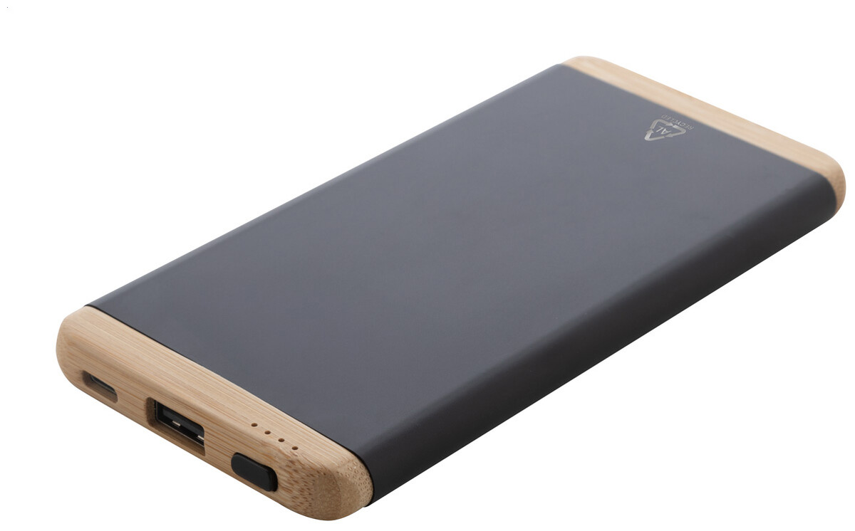Power banka z recyklovaného hliníku a bambusu s baterií 5000 mAh. S 1 portem USB a 1 portem USB-C pro nabíječku. Vstupní port USB-C. Včetně USB nabíjecího kabelu.