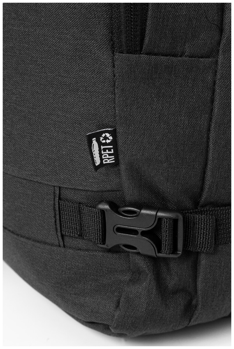Dvojfunkční RPET batoh a taška na dokumenty se 2 přihrádkami na zip, přední kapsou na zip a polstrovanou přihrádkou na notebook (15"). S kapsou proti krádeži, popruhem na vozík, polstrovanými zády a ramenními popruhy. Polyester 600D RPET, s výrazným štítkem RPET.