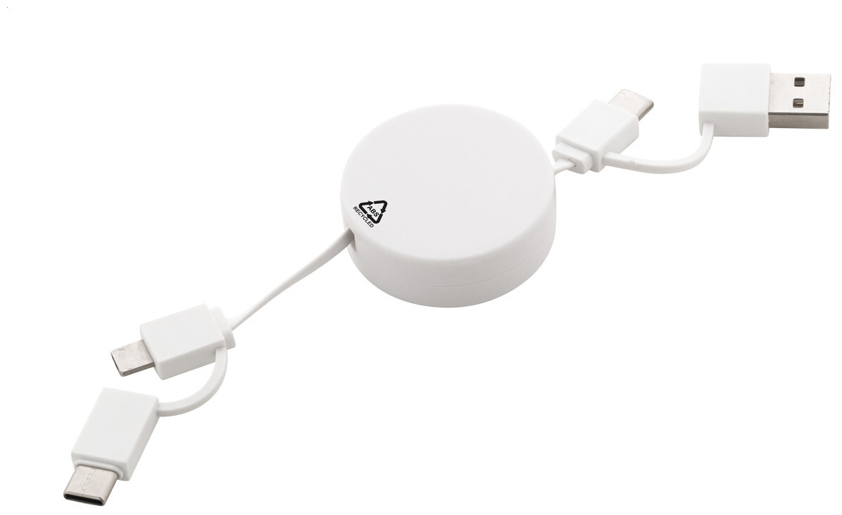 Teleskopický nabíjecí kabel USB z recyklovaného ABS s konektory micro USB, USB-C a Lightning. Se vstupy USB a USB-C.