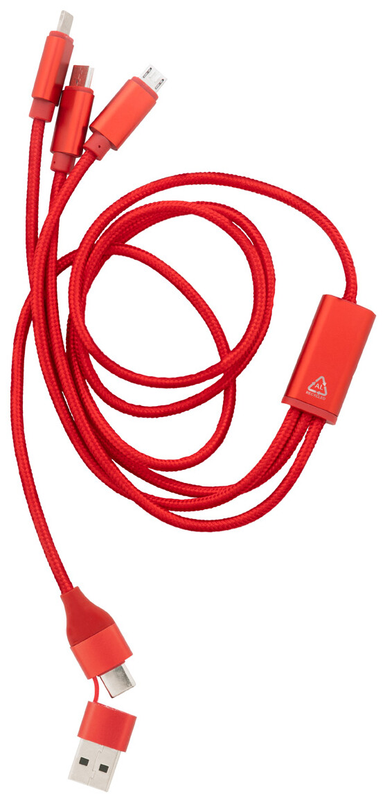 USB nabíjecí kabel z recyklovaného hliníku a RPET s konektory micro USB, USB-C a Lightning. Se vstupy USB a USB-C. Délka kabelu: 100 cm.