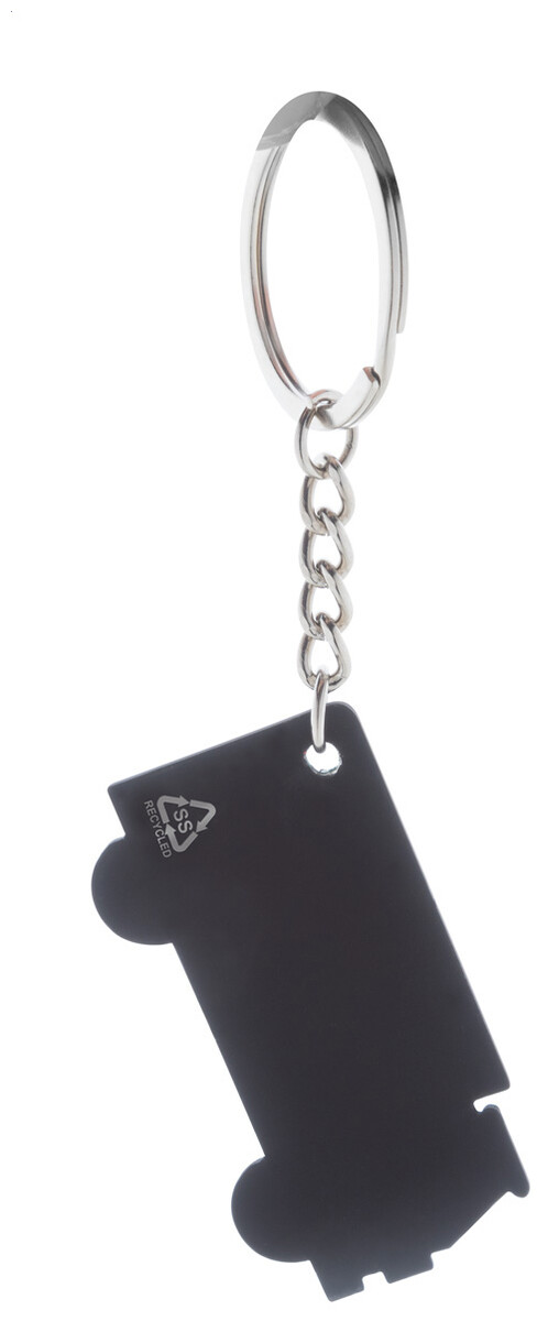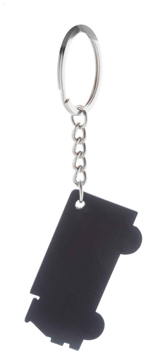 Přívěšek na klíče z recyklované nerezové oceli ve tvaru nákladního auta s pogumovaným povrchem. Se speciální vrstvou pro zrcadlové laserové gravírování.