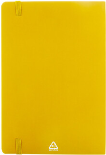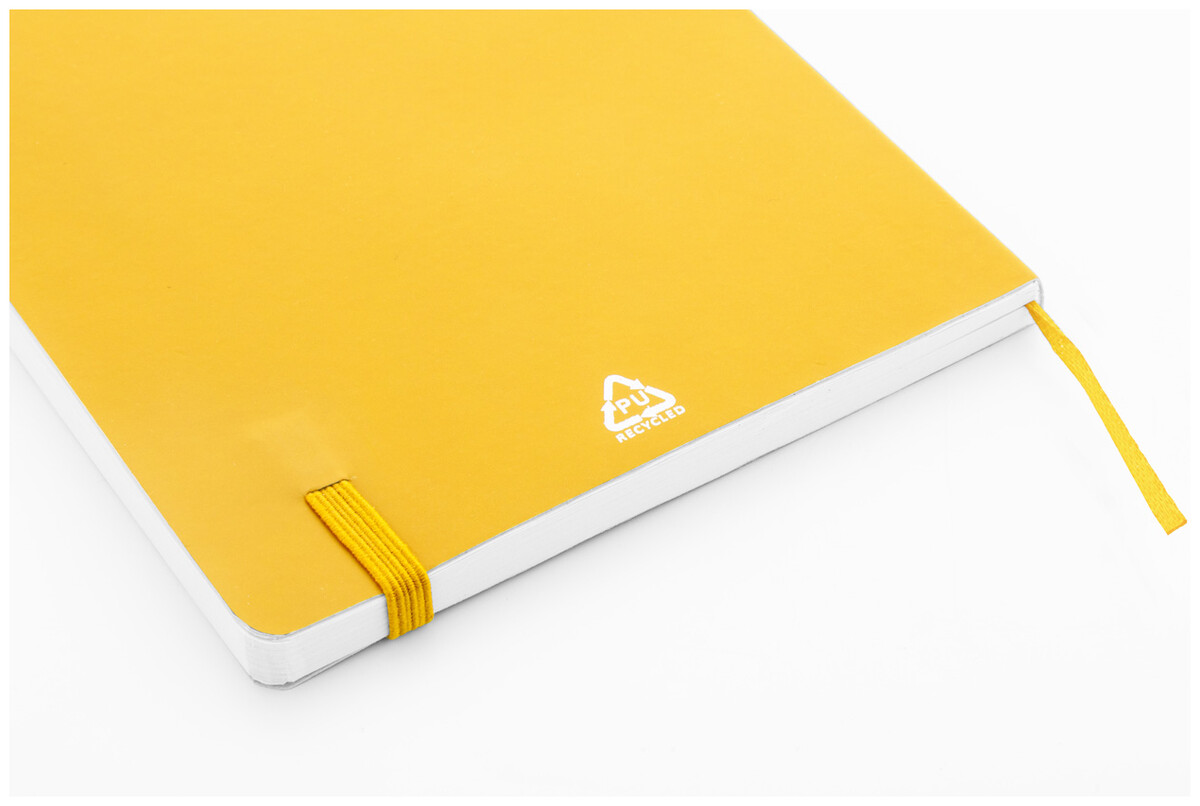 Blok A5 z recyklované PU kůže s měkkou vazbou s 80 linkovanými listy z recyklovaného papíru. Se záložkou v odpovídající barvě a gumičkou.