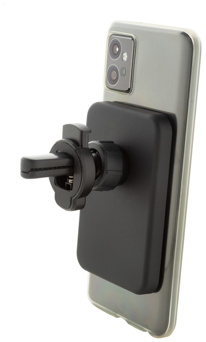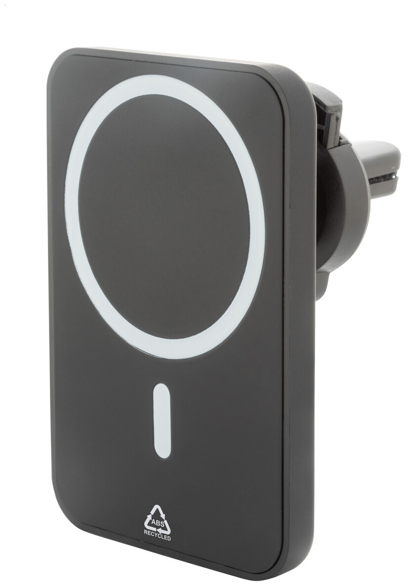 Magnetický držák na mobil do auta v recyklovaném ABS pouzdru s vestavěnou bezdrátovou rychlonabíječkou (15W) a nastavitelným upevněním do větracího otvoru. Včetně samolepícího kovového kroužku pro použití magnetické funkce na jakémkoli bezdrátově nabíjecím zařízení. Kompatibilní s iPhone® 12 nebo novějším. Včetně USB nabíjecího kabelu.