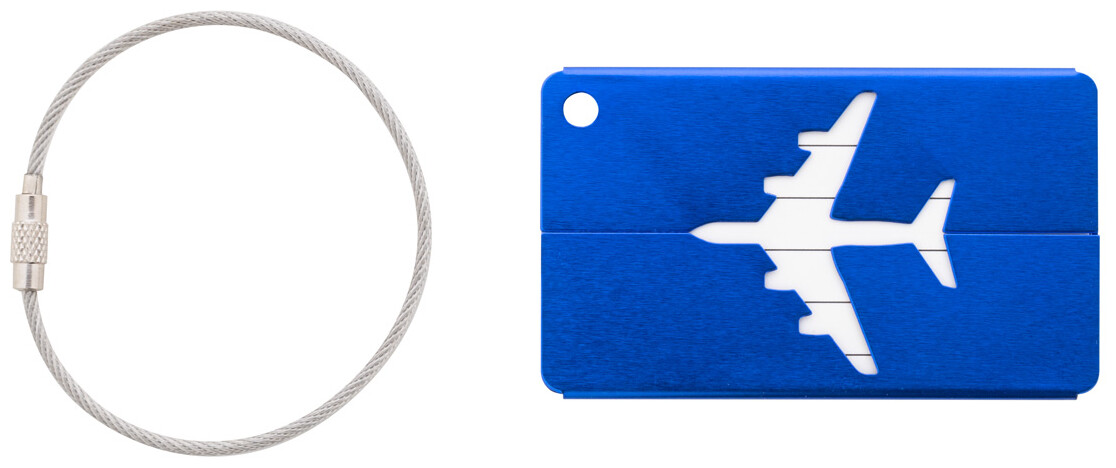 Hliníková visačka na zavazadla s motivem letadla a kovovým lankem.
