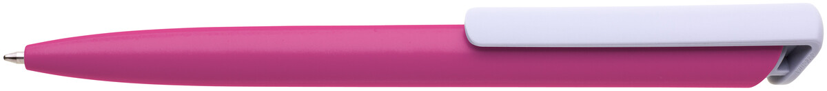 Česká propiska BOIA v minimalistickém designu tmavě růžového oválného těla s dynamickým tvarem bílého masivního klipu. Tělo i klip nabízí velký prostor pro značení logem zákazníka. Materiál plast, náplň velkoobsahová, modře píšící. BOIA je vyráběna v České republice.