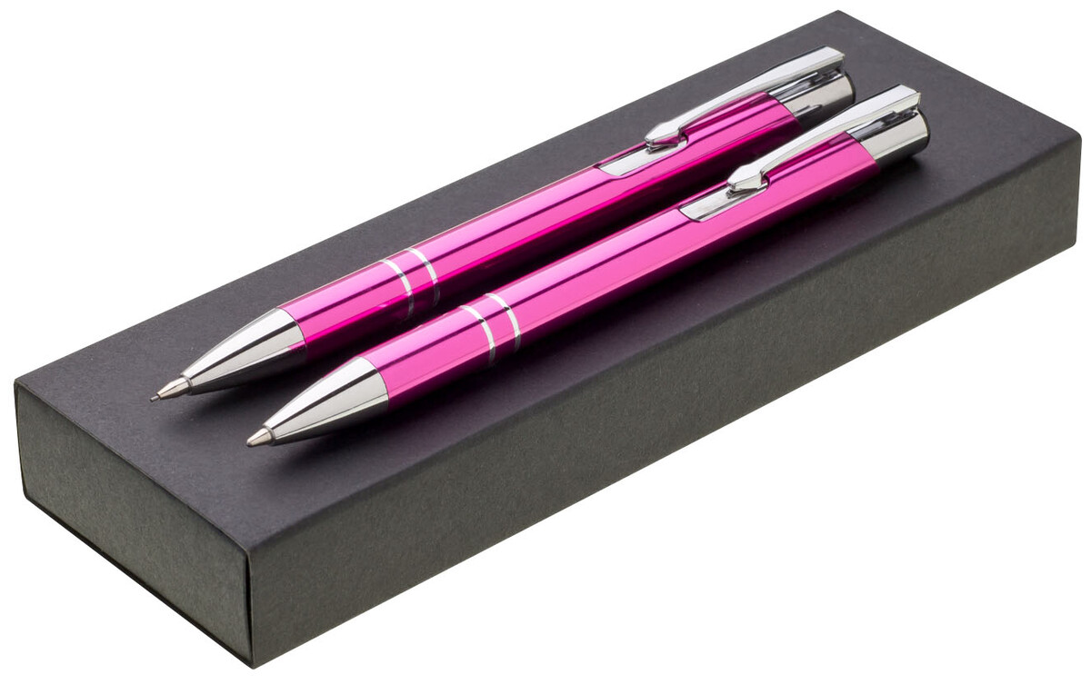 Sada ORIN růžová, tužky jsou vyrobeny z hliníku, na těle mají 2 stříbrné proužky a doplňky. Dodávají se v papírové krabičce.