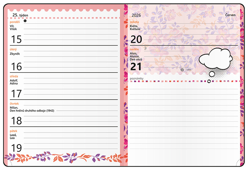 - tištěná grafika potažená nepoškrabatelným matným laminem s parciálním lakem, šitá vazba V8, stužka, perforované rožky, kulaté rohy