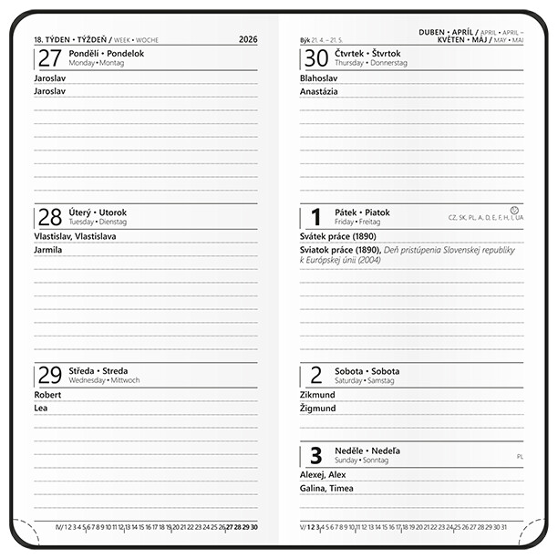 - osobní údaje, přehledný kalendář aktuálního roku a následujícího roku, měsíční plánování aktuálního roku, plán dovolených aktuálního roku, jmenný seznam CZ/SK, mezinárodní svátky, roční plánovací kalendář CZ aktuálního roku, místo pro poznámky
