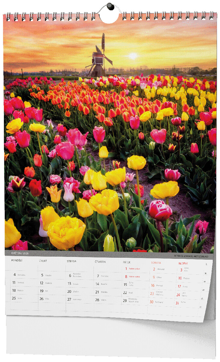 - kovová spirála "twin wire" po celé šířce kalendáře s háčkem pro zavěšení, obálka je tištěna na křídový papír s gramáží 150 g/m2, spodní karton je z kvalitní bílé lepenky v gramáži 600 g/m2