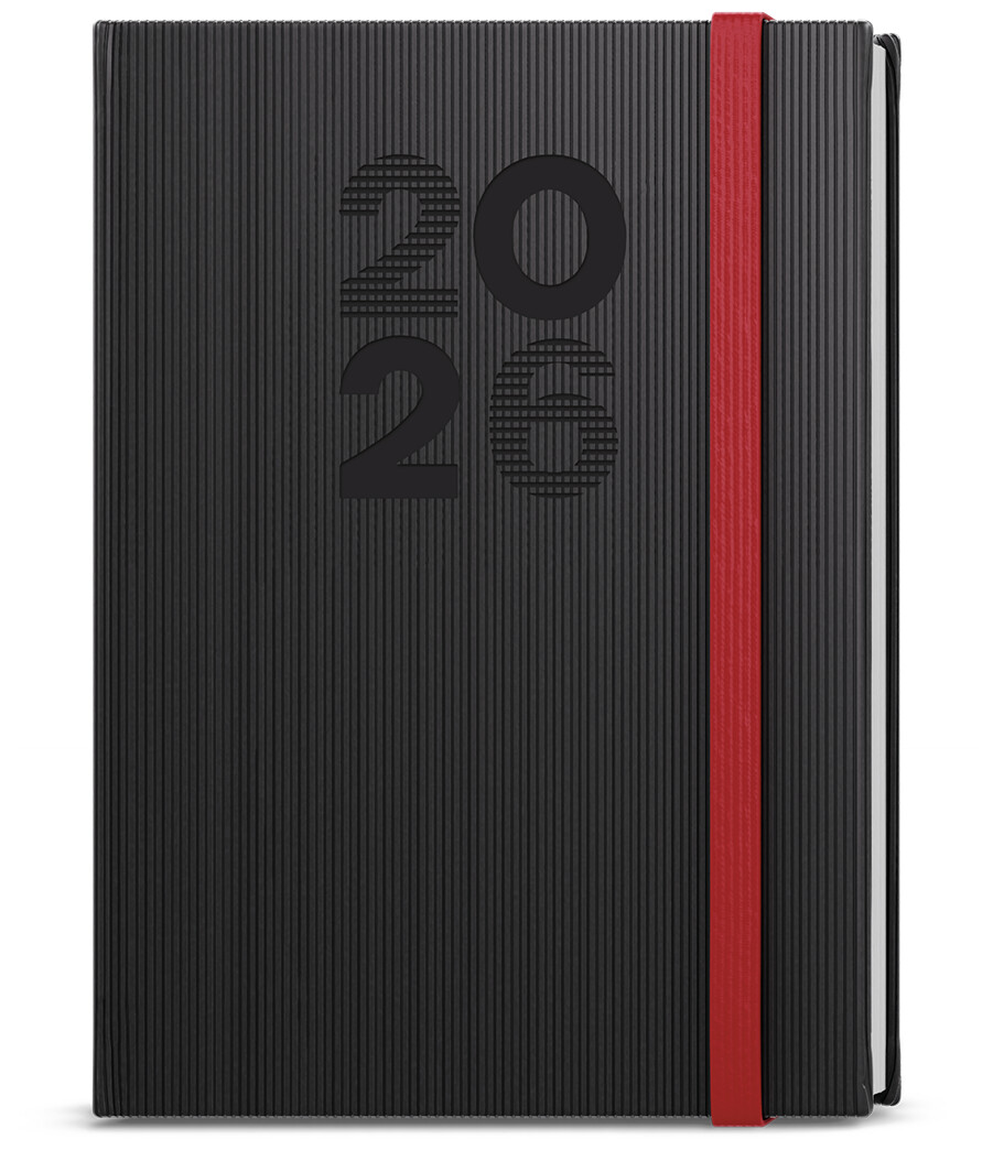 Týdenní diář formátu A5 vyrobený ze strukturovaného materiálu v černé barvě a s gumičkou. Oblíbená grafika vnitřního bloku Vám pomůže účelně plánovat Vaše dny.