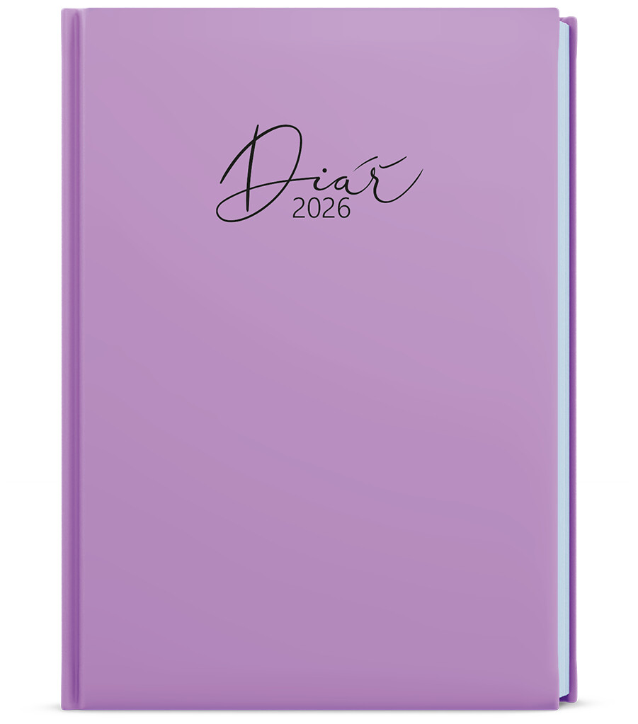 Týdenní diář v sametovém laminu s parciálním lakem v pastelově fialové barvě. Je vyráběný ve formátu A5, má velký prostor pro poznámky a plánování.