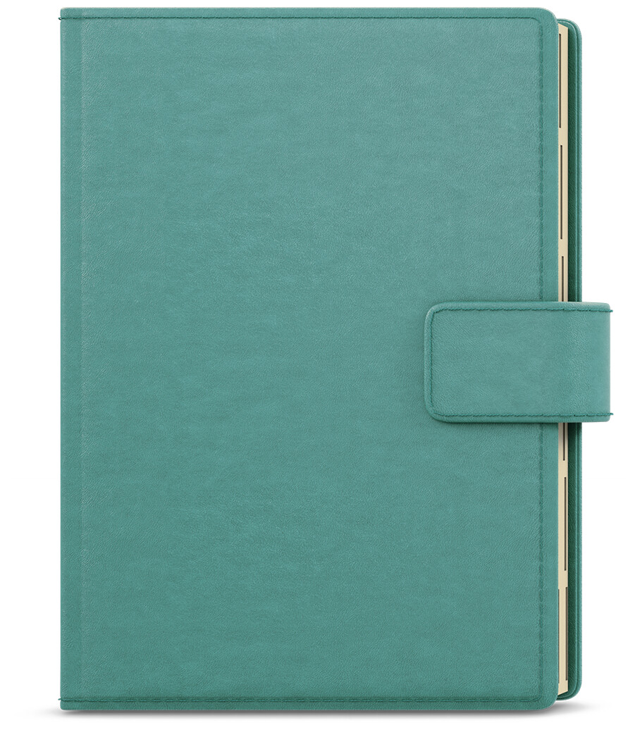 Elegantní týdenní diář ve formátu A5 se stylovým a znovupoužitelným obalem v tyrkysové barvě. Praktické vnitřní uspořádání nabízí množství přihrádek na vizitky, poutko na tužku a bezpečné magnetické zavírání. Diář bude působit luxusně a profesionálně – ideální volba pro práci, podnikání i osobní organizaci.