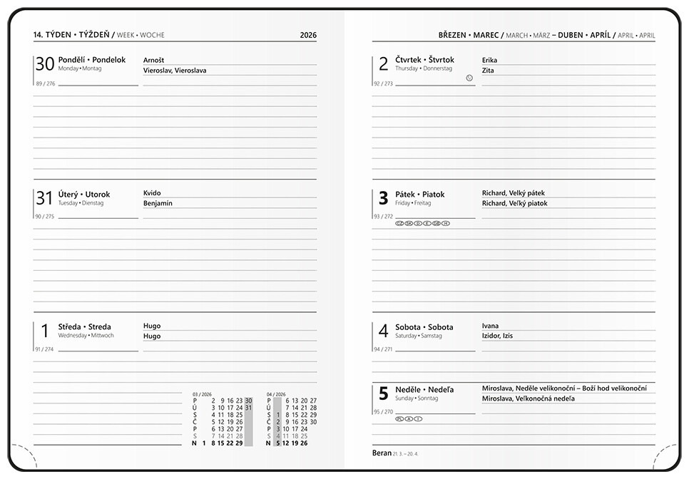- osobní údaje, přehledný kalendář aktuálního roku a následujícího roku, měsíční plánování aktuálního roku, plán dovolených aktuálního roku, přehled státních svátků a významných dnů CZ/SK, jmenný seznam CZ/SK, mezinárodní svátky, daňový kalendář CZ/SK aktuálního roku, roční plánovací kalendář CZ/SK aktuálního roku, místo pro poznámky, zadní předsádka - kapsa
