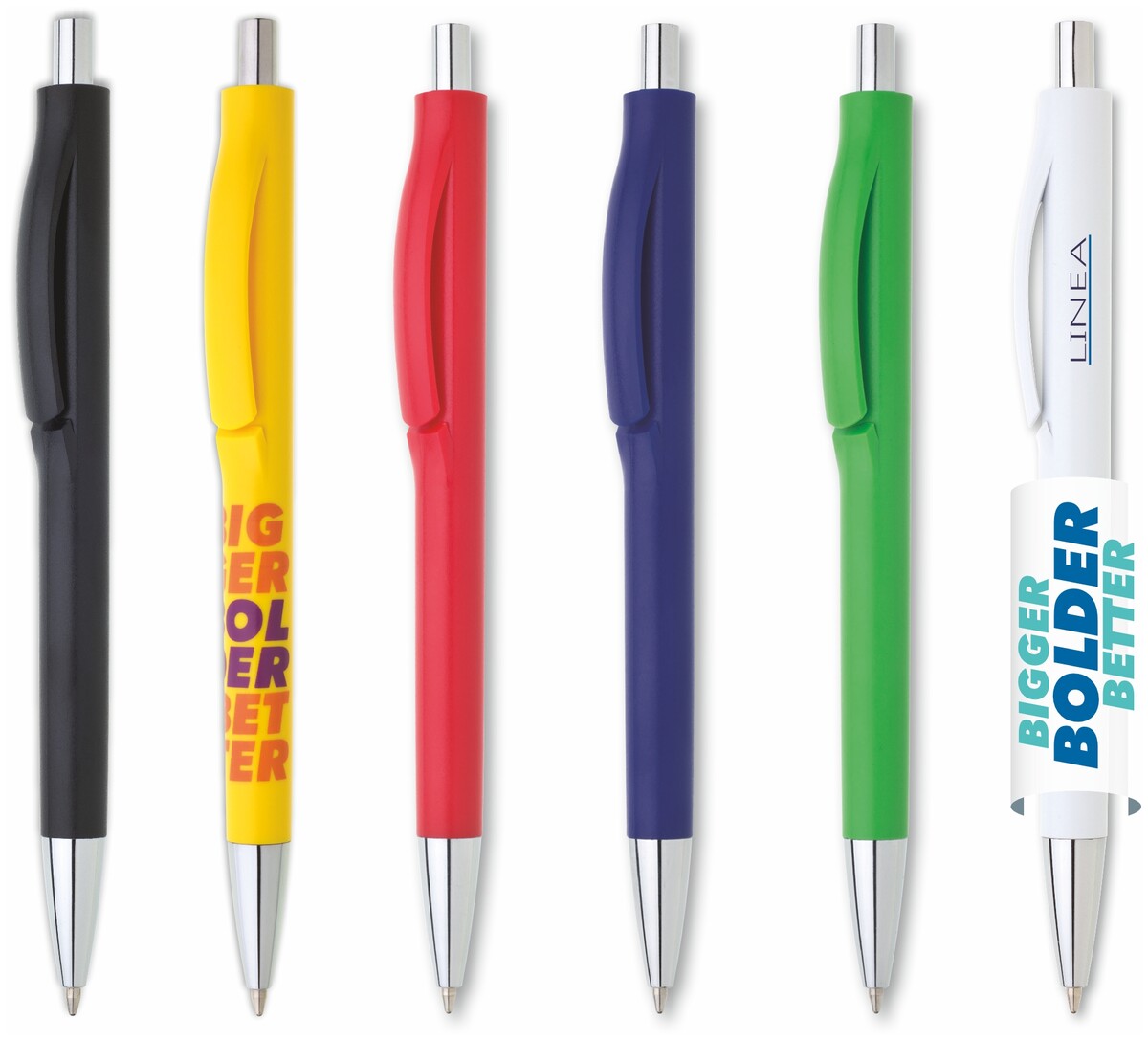 Propiska LINEA modrá má zajímavě řešený klip a stříbrné doplňky, modře píšící náplň. Kolekce DESIGN.