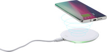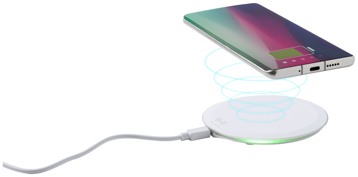 Bezdrátová rychlonabíječka (10W) v plastovém pouzdře s LED indikátorem nabíjení a protiskluzovou základnou. Včetně nabíjecího USB kabelu.