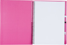 Poznámkový blok A4 s 80 čistými listy a spirálovou vazbou v kartonových deskách, vč. stejně barevného kuličkového pera z recyklovaného papíru s modrou náplní.