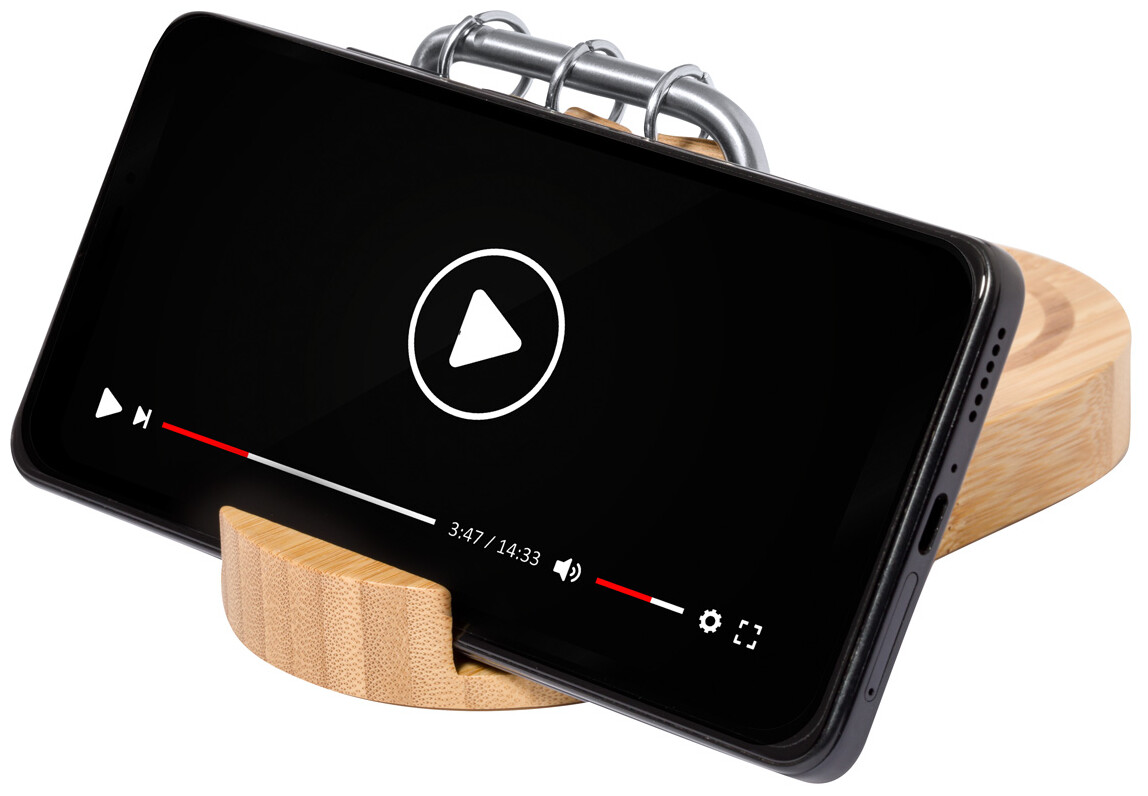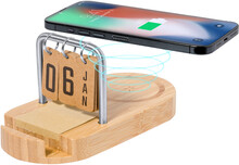 Bambusová, multifunkční bezdrátová rychlonabíječka (15W) s držákem na mobil a věčným kalendářem na kovovém rámu. S porty USB a USB-C pro nabíječku. Včetně 50 listů kraftových papírových lepících lístků a USB nabíjecího kabelu.