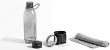 Plastová multifunkční sportovní láhev s chladicím ručníkem (390 g/m2) ve spodní přihrádce a výsuvným držákem na mobilní telefon. V dárkovém balení. Objem 650 ml. Není vhodná pro sycené nápoje.