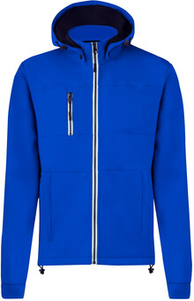 Větru a voděodolná softshellová bunda na zip se 2 bočními kapsami, 1 přední kapsou, stojáčkem a odepínací kapucí. 100% polyester, 300 g/m2.