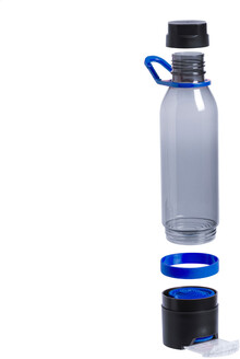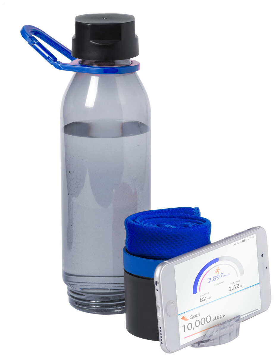 Plastová multifunkční sportovní láhev s chladicím ručníkem (390 g/m2) ve spodní přihrádce a výsuvným držákem na mobilní telefon. V dárkovém balení. Objem 650 ml. Není vhodná pro sycené nápoje.