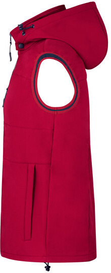 Větru a voděodolná softshellová vesta na zip se 2 bočními kapsami, 1 přední kapsou, stojáčkem a odepínací kapucí. 100% polyester, 300 g/m2.
