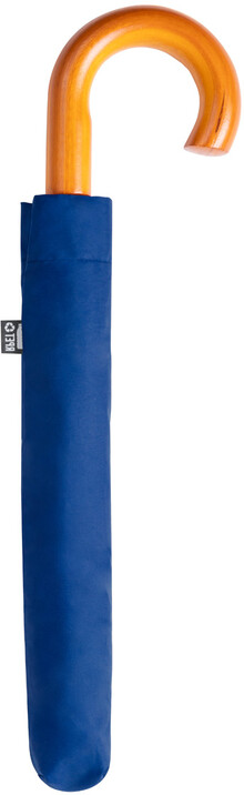 Automatický, větruodolný skládací deštník s 8 panely v pouzdru v odpovídající barvě. S kovovým rámem a dřevěnou rukojetí. Pongee 190T RPET. S výrazným štítkem RPET.