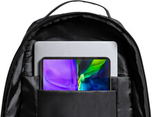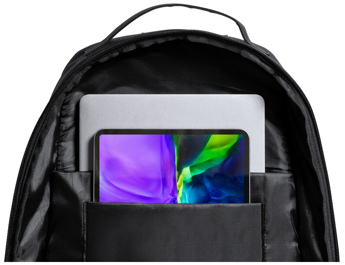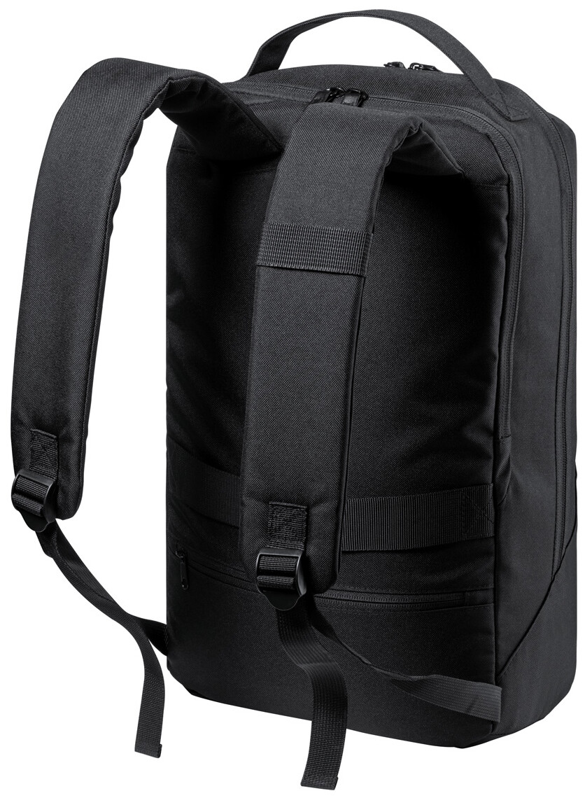 Vodotěsný batoh RPET s přihrádkami na zip, polstrovanou přihrádkou na notebook (15") a tablet (10"), popruhem na vozík, skrytou kapsou proti krádeži, ergonomickými zády a ramenními popruhy. 600D RPET polyester s výrazným štítkem RPET.