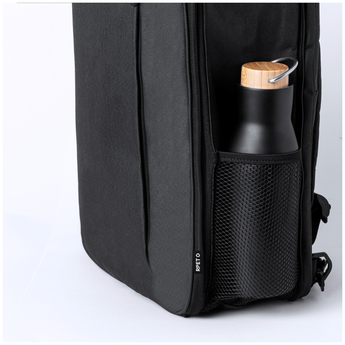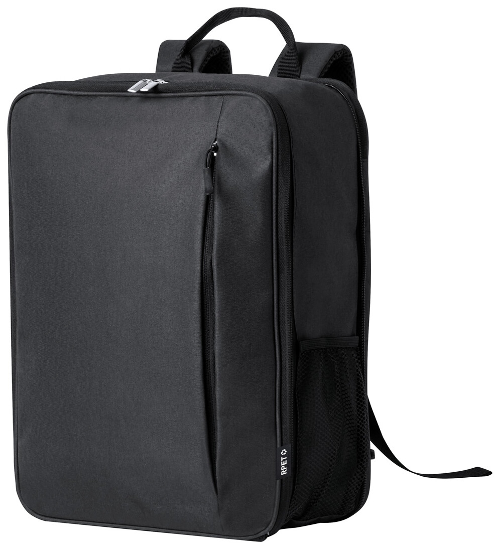 Rozšiřitelný RPET batoh s přihrádkami na zip, polstrovanou přihrádkou na notebook (15") a tablet (10"), polstrovaná záda a ramenní popruhy. 300D RPET polyester s výrazným štítkem RPET.