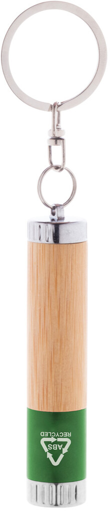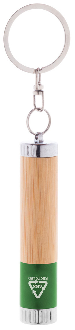 Mini svítilna z bambusu a recyklovaného ABS plastu s 1 LED a kovovým kroužkem na klíče. S knoflíkovou baterií.