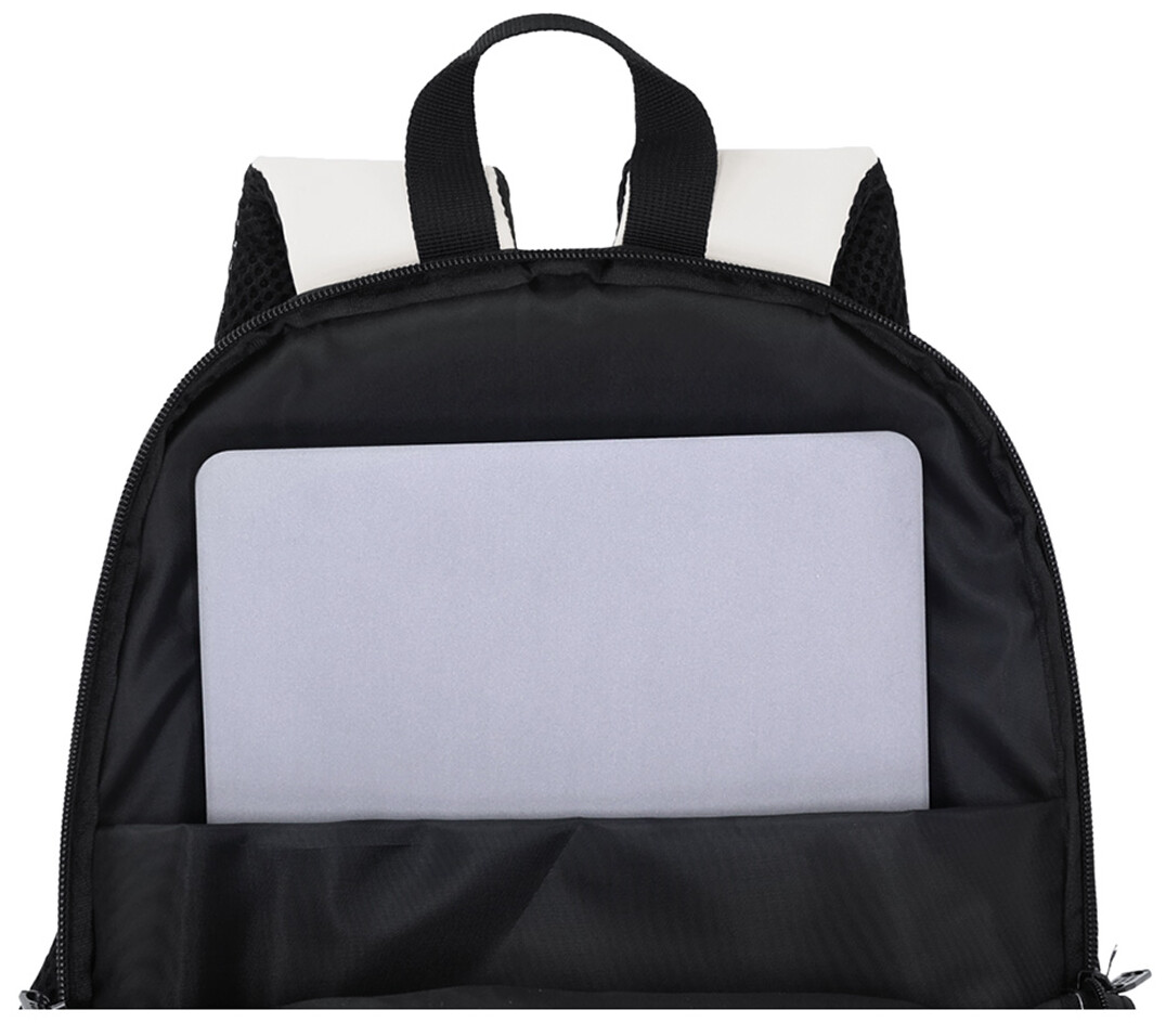 Batoh z měkké PU kůže s přihrádkou na zip, polstrovanou přihrádkou na notebook (15"), bočními kapsami, polstrovanými zády a ramenními popruhy.